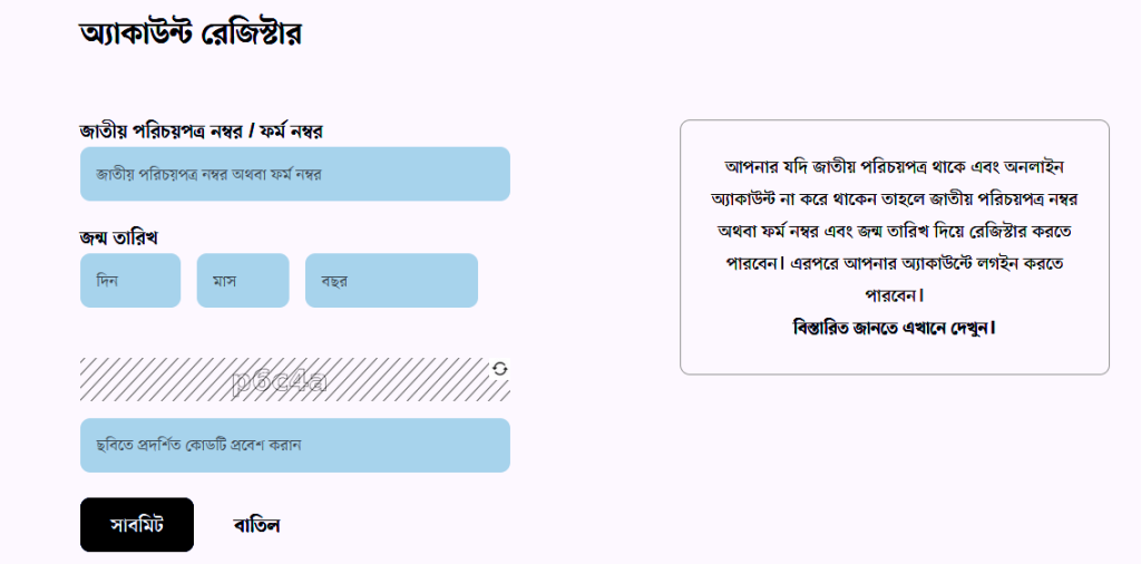 ১। প্রথমে এই লিংকে ভিজিট করে (https://services.nidw.gov.bd/nid-pub/claim-account) রেজিস্ট্রেশন সম্পুর্ন করুন ।